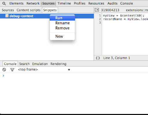 A keyboard shortcut is also available for easily executing a snippet - just select your snippet then use Ctrl/Cmd + Enter to run it. This replicates the behavior of the Run (>) button - currently in the Sources console, but which will be moving into the debugger control in the near future.